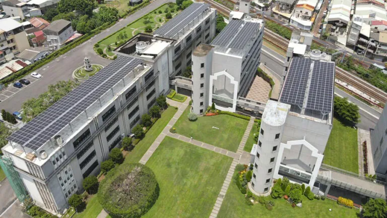 本案位於臺南市北區,校內建物皆為RC鋼構建築,其中包含學校行政大樓、教室建物、宿舍以及體育館等,總計八棟建物。2022年完工掛表併聯,設置容量總計755.15kW。設計規畫中特別的是屋頂為圓弧狀的體育館(云和館),利用現有浪板,搭配每片太陽能模組使用三組鋁擠型支架座鎖固;其他七棟建物採棚架式設計,施工工法採用植筋基座並於柱敦採高密度水泥包覆,屋頂地面我們配合校方將年限已久的舊隔熱磚敲除,並另外強化修復,最後以綠建材PU施作全防水層塗佈,對於室內防水、溫度控制及節能減碳效益皆有加值效果。