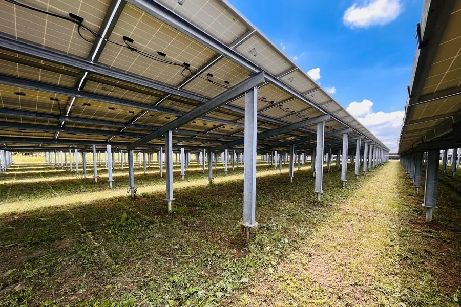 本案為地面型系統,日照良好無遮蔭,發電狀況佳。因土地與既有道路及便道相鄰,故向內退縮≧1.5m,確保用路人與行車安全;採高支架設計,保有足夠日照以涵養土地。