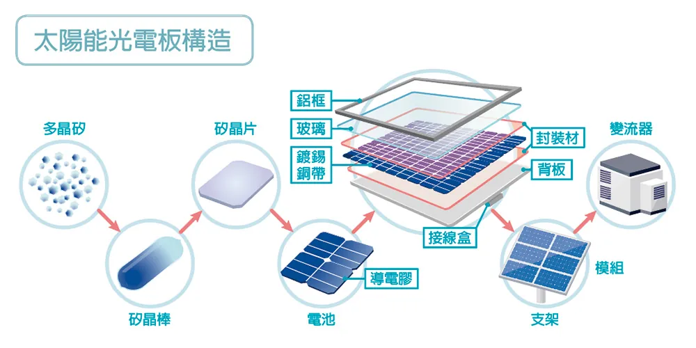 台灣主流使用的矽晶類太陽能板,其組成成分為玻璃74.2%、鋁框架10.3%、電池4%等,高達90%以上都可以回收再利用。